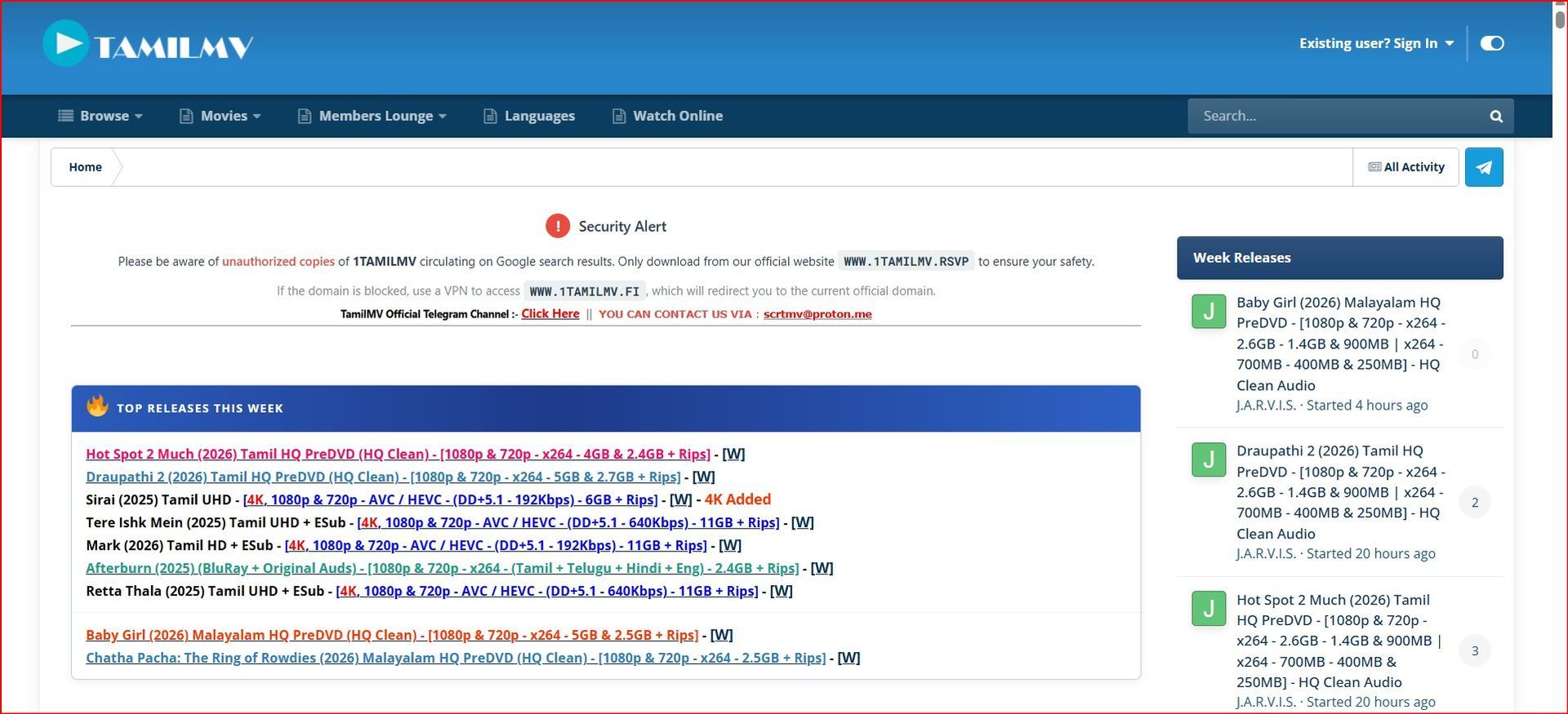 TamilMV frequently changes its domain names due to pressure from copyright holders and government authorities. When one domain is blocked, mirror sites are quickly launched using different extensions and servers.